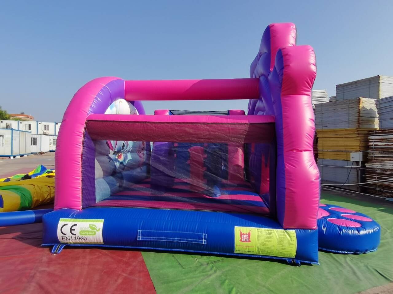 • Velkou skákací plochu, barevné překážky a skluzavku s bezpečným dopadištěm